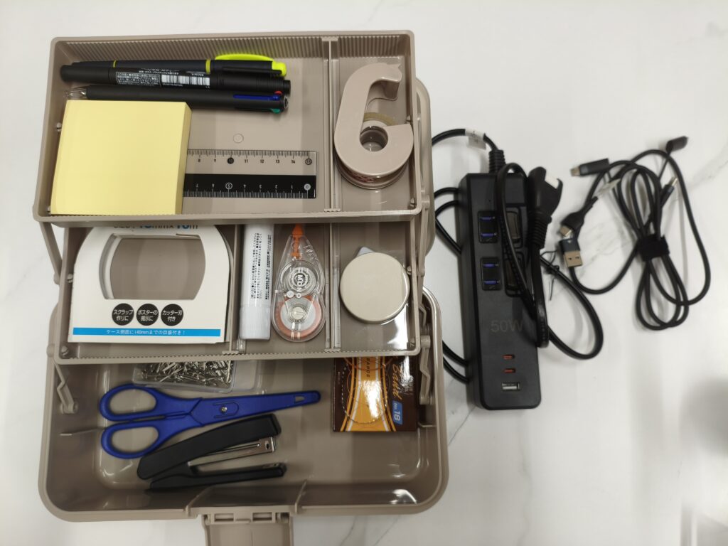 • 事務用品(ペン、定規、セロハンテープ、ふせん、両面テープ、のり、修正テープ、朱肉、ホッチキス、ハサミ、クリップ、輪ゴム)