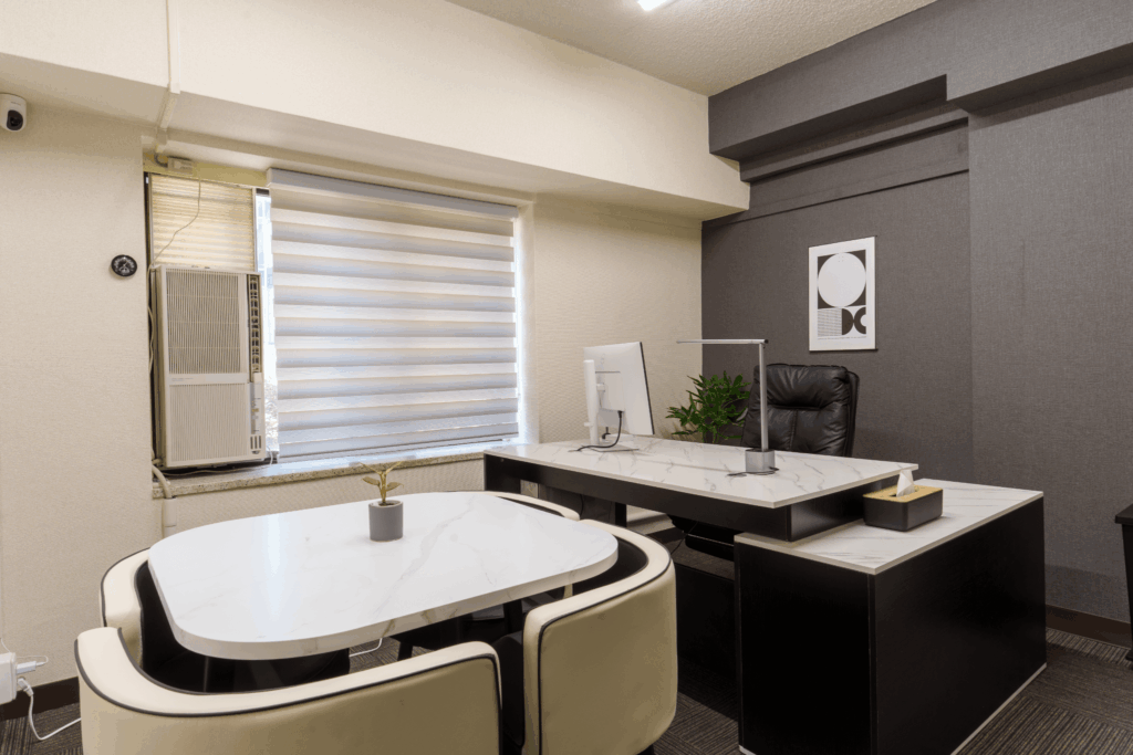 • 社長室のような少しリッチな雰囲気で、集中して作業できる環境をご用意。Wi-Fiや電源、PCモニターなど作業や打合せに必要な備品も揃い、快適にご利用いただけます。